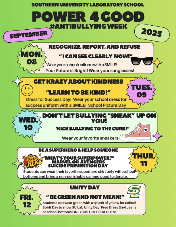The Southern University Laboratory School is proud to announce Anti-Bullying Week 2025, themed “Power 4 Good”. From Monday, September 8th, through Friday, September 12th, our Kitten family will come together to promote kindness, respect, and courage while standing united against bullying.