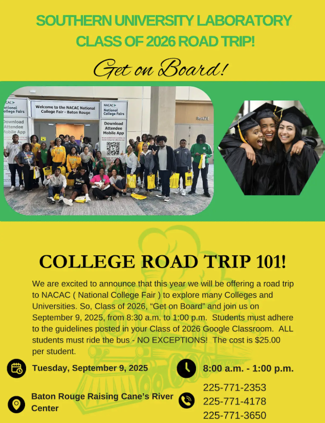 September 9 – Senior Trip (National College Fair) Seniors, to attend the Baton Rouge National College Fair held at the Raising Cane's River Center on Tuesday, September 9th, from 9 am to 11 am. Students will be transported to Mr. Gatti's after loading the bus at 11 am, and then arrive at Mr. Gatti's at 11:30 am. Students will have lunch at Mr. Gatti's from 11:30 am until 12:30 pm. Arrival time back at SU Lab for 1:00 pm. Students will be assessed a $25 fee to include the cost of the bus (transportation) and food (Mr. Gatti's Pizza). Cost for 2 buses $750 (SU Lab bus and Benny's bus). Purchase your ticket here