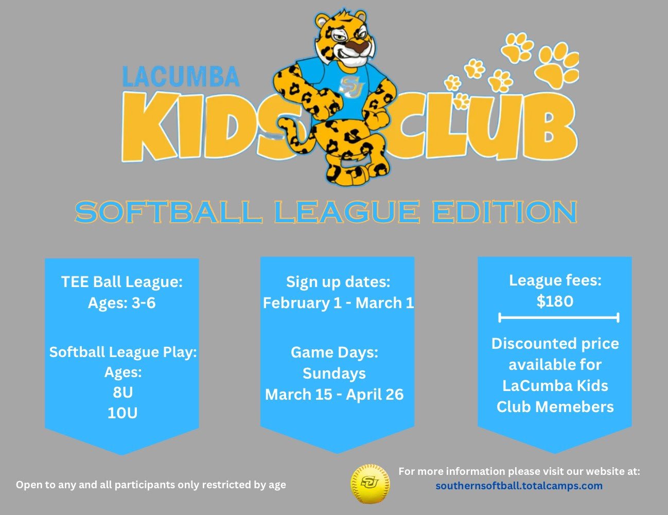 Do you have a little one who loves to run, play, and try new things? The Lacumba Kids Club Softball League is now open for registration, and we’re inviting all Young Kittens to join us for an exciting season of fun, learning, and teamwork on the field!
