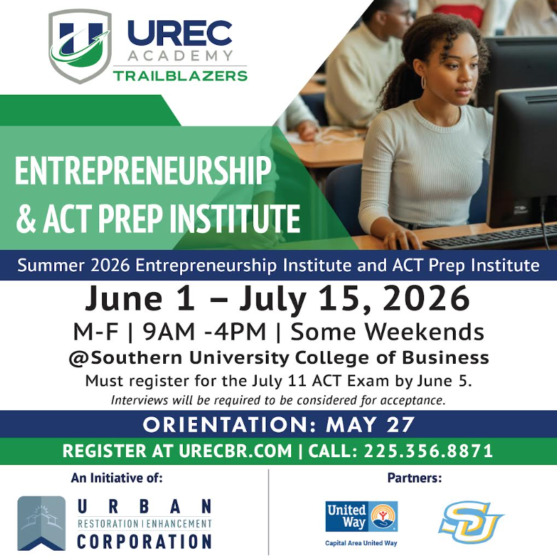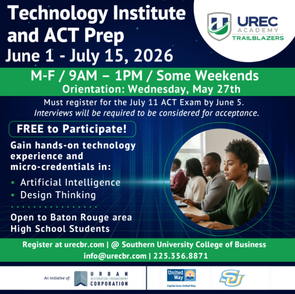 Southern University Laboratory School students are encouraged to take advantage of an exciting FREE summer enrichment opportunity on the campus of Southern University, sponsored by UREC Academy. From June 1 through July 15, 2026, high school students can participate in hands-on learning through the UREC Academy Entrepreneurship Institute and the Technology & ACT Prep Institute—two high-impact programs designed to strengthen college and career readiness.